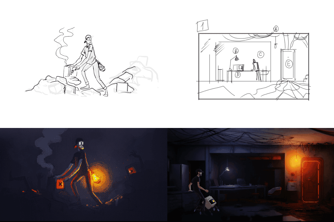 We started by brainstorming a script, putting together a mood board, and crafting a main storyboard, all based strictly on our character dialogues. Worth mentioning is that this story does feature characters from our PC game, Looper. Thus, you can think of this project as an exciting extension of that original narrative and lore.
